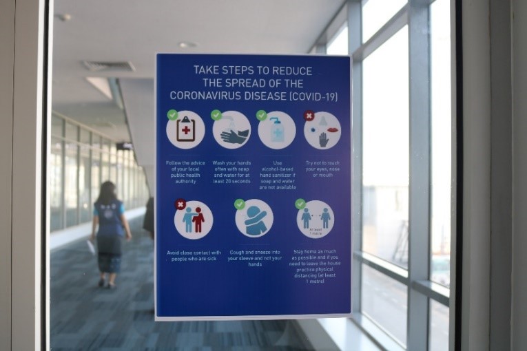 Once the passengers get off the plane, there are posters in the terminal to remind passengers on taking steps to protect themselves to reduce the spread of COVID-19.