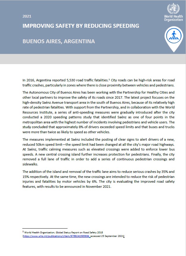 The Autonomous City of Buenos Aires has been working with the Partnership for Healthy Cities and other local partners to improve the safety of its roads since 2017. The latest project focuses on the high-density Saénz Avenue transport area in the south of Buenos Aires, because of its relatively high rate of pedestrian fatalities. With support from the Partnership, and in collaboration with the World Resources Institute, a series of anti-speeding measures were gradually introduced after the city conducted a 2020 speeding patterns study that identified Saénz as one of four points in the metropolitan area with the highest number of incidents involving pedestrians and vehicle users. The study concluded that approximately 8% of drivers exceeded speed limits and that buses and trucks were more than twice as likely to speed as other vehicles.