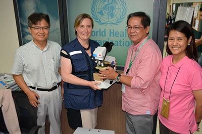 WHO Representative in the Philippines Dr Julie Hall, and WHO Medical Officer for TB Dr Woo-Jin Lew formally hand over one of the fifty high powered biological microscopes to the Department of Health’s Director of the Infectious Disease Office Dr Mario S. Baquilod. The microscopes, which were donated by the people of Japan, would enable laboratories in calamity afflicted areas to conduct sputum examinations to help in the diagnosis of Tuberculosis.