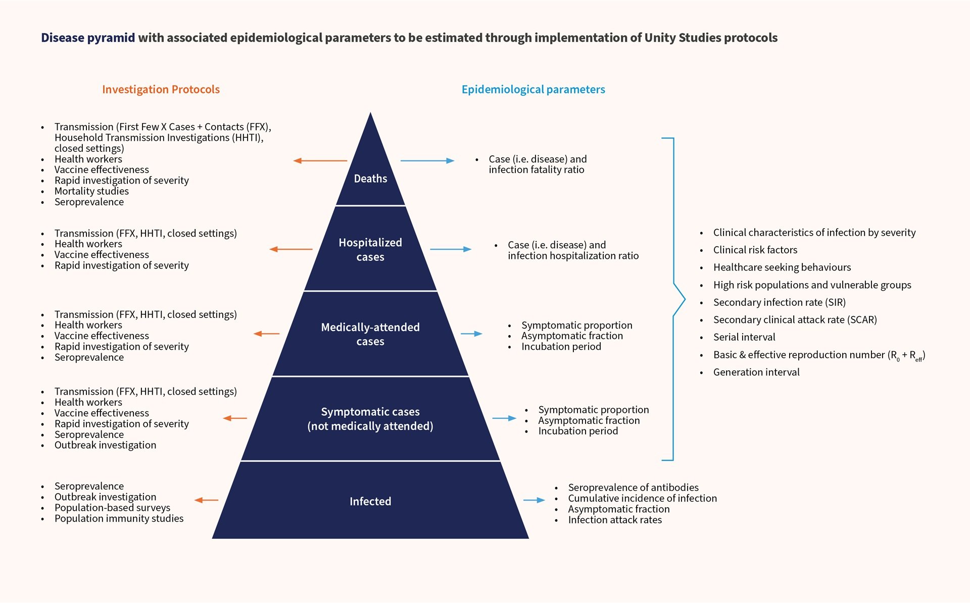 Figure 1: Disease pyramid of a given respiratory infection, the Unity Studies protocols and associated epidemiological parameters
